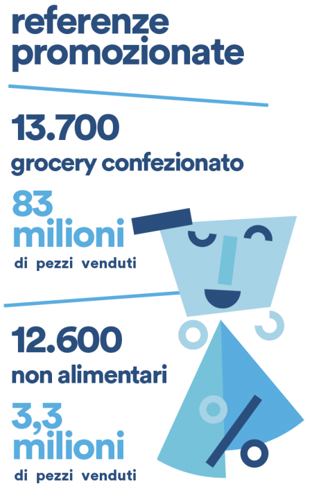 Complessivamente, nel corso del 2021, per le sole promozioni comunicate tramite volantino, nel grocery confezionato sono state proposte con meccanica di sconto circa 13.700 referenze che hanno generato vendite per più di 83 milioni di pezzi. Nel non alimentare le referenze promozionate in volantino sono state 12.600 ed hanno generato vendite per circa 3,3 milioni di pezzi. L’offerta promozionale ha consentito d’erogare circa 106 milioni di euro di sconto. Circa 93 milioni di euro esclusivi ai Soci della Cooperativa.